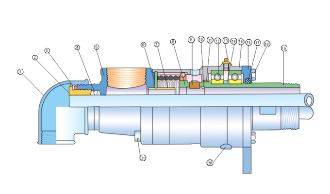 1.弯头2.填料压盖3.锁紧螺母4.密封填料5.三通端盖6.垫圈7.保护套8.波纹补偿器9.密封环10.定位套11.密封圈12.轴承13.油杯14.轴承挡圈15.壳体16.压盖17.油封18.六角头螺栓19.外管20.放油塞21.内六角螺栓 D系列旋转接头采用双端面密封,结构较复杂。滚动轴承使摩擦扭矩相对减小,不锈钢波纹管补偿器使旋转接头更耐腐蚀,且弹簧外装不与介质接触使密封更可靠。 与设备相连的外管(19)是主要的旋转部件。平面密封环(9)靠定位套(10)定位浮动在外管、补偿器(8)间并组成双端面密封摩擦副,弹簧随时提供密封所需的端面压力。为了便于观察密封环磨损及密封状况,在壳体(15)上设有观察孔。在高温时轴承应请注意定期润滑。 使用条件 使用流体:冷却水、热水、冷水、压缩空气 最大压力:1.5MPa 最高温度:180℃ 最高转速:250r/min